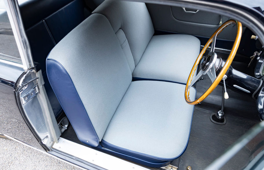 The restoration progressed between 2000 and 2019 and included re-chroming the brightwork and fitting a new front bumper. The interior was re-trimmed in the correct light grey woolcloth and blue vinyl, the mill used an original unfaded piece of fabric as a reference before weaving new material. The interior was completed with new rubber floormats.